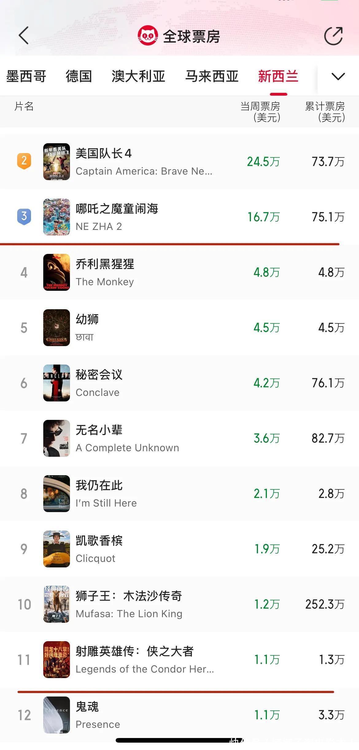 新西兰电影票房周榜:《哪吒2》第三,《射雕》第十一