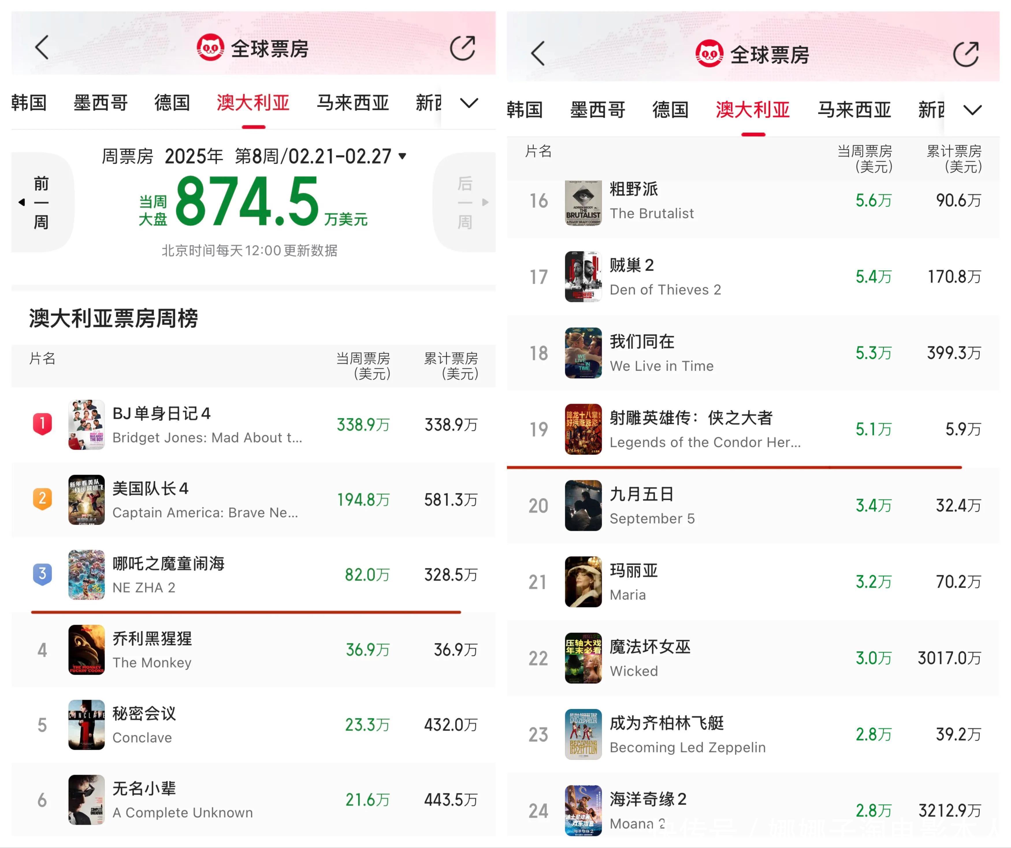 澳大利亚电影票房周榜:《哪吒2》第三,《射雕》第十九