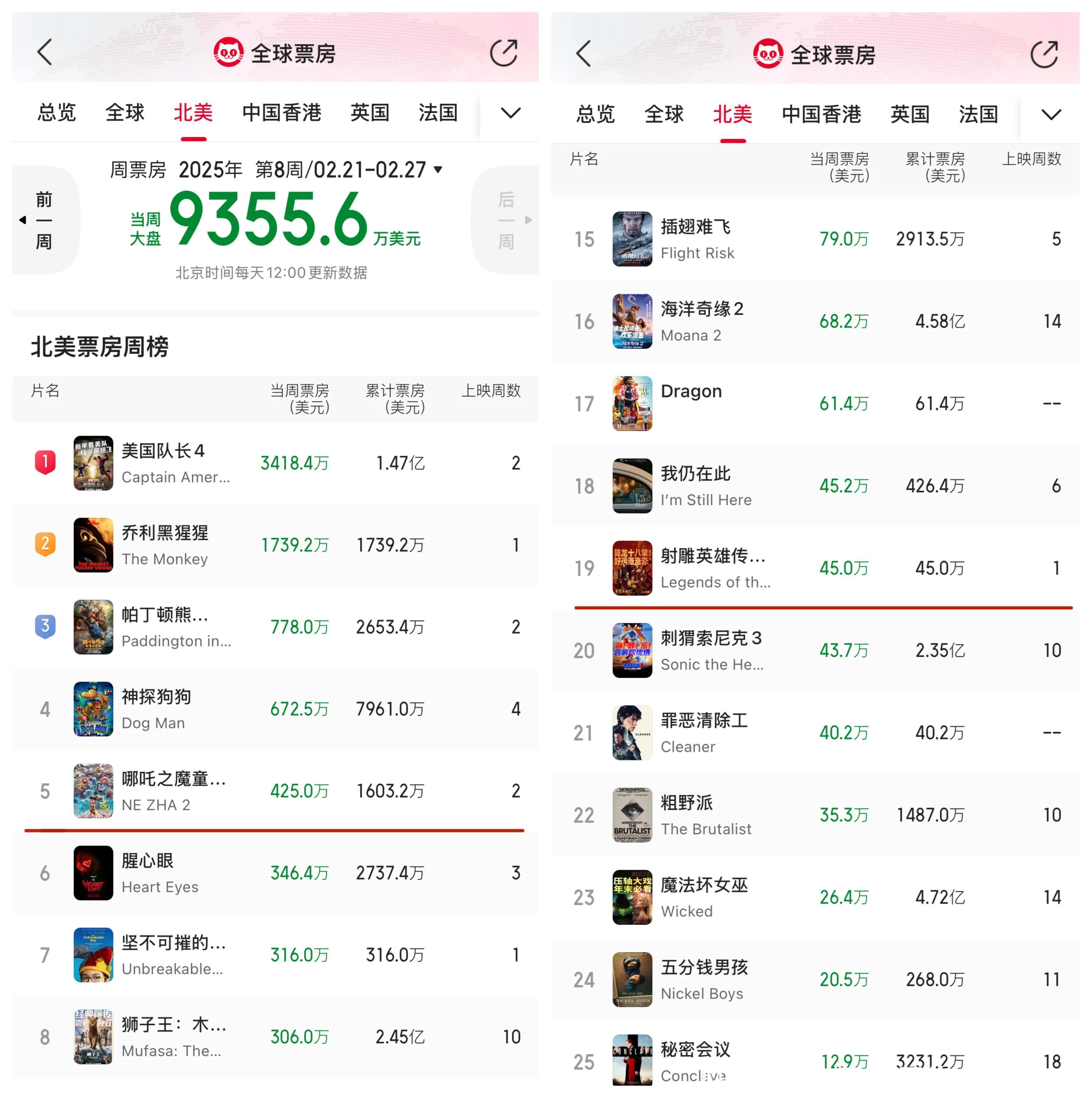 北好意思市集电影票房周榜:《哪吒2》第五,《射雕》第十九