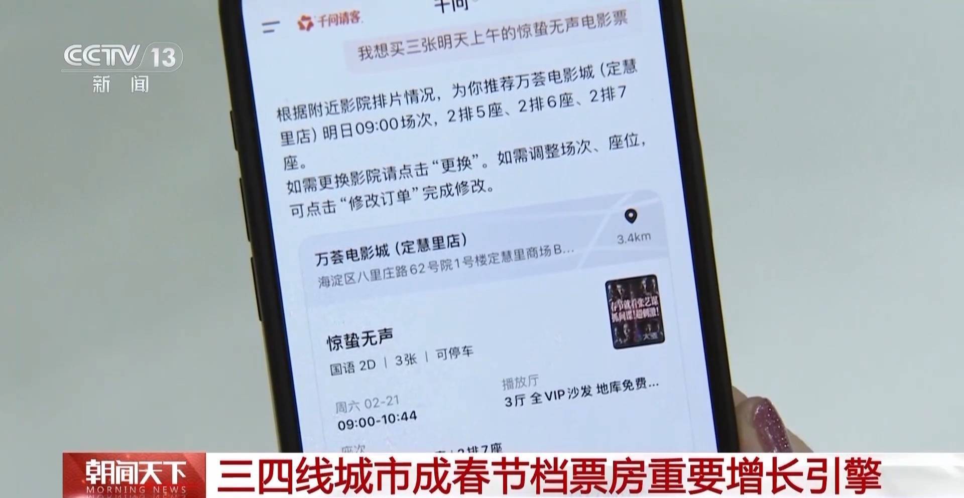 电影数据分析师 陈晋:截止刻下,三、四线城市孝顺了本年春节档总票房的53.72%,较前年大幅增长,同期亦然积年春节档最高孝顺率。千问App近期发布的数据闪现,用户通过AI在大麦买电影票的订单环比增长372倍,其中来自三、四线城市的AI订单暴涨了782倍,三、四线城市的春节档上风在抓续扩大。