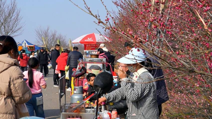梅花盛放带旺了旅游热度,更激活了乡村经济的“一池春水”。梅园邻近,村民们自觉树立摊位,摆满太子米、土鸡蛋等腹地农特产物,在便利旅客的同期,拓宽了自家增收渠说念,让“赏花经济”实真是在升沉为“增收红利”。华锌(太子米)产业园认真东说念主刘磊暗示,梅花洞开后旅客量激增,他们每天齐会带着自产太子米到梅园销售,销售额零散可不雅。