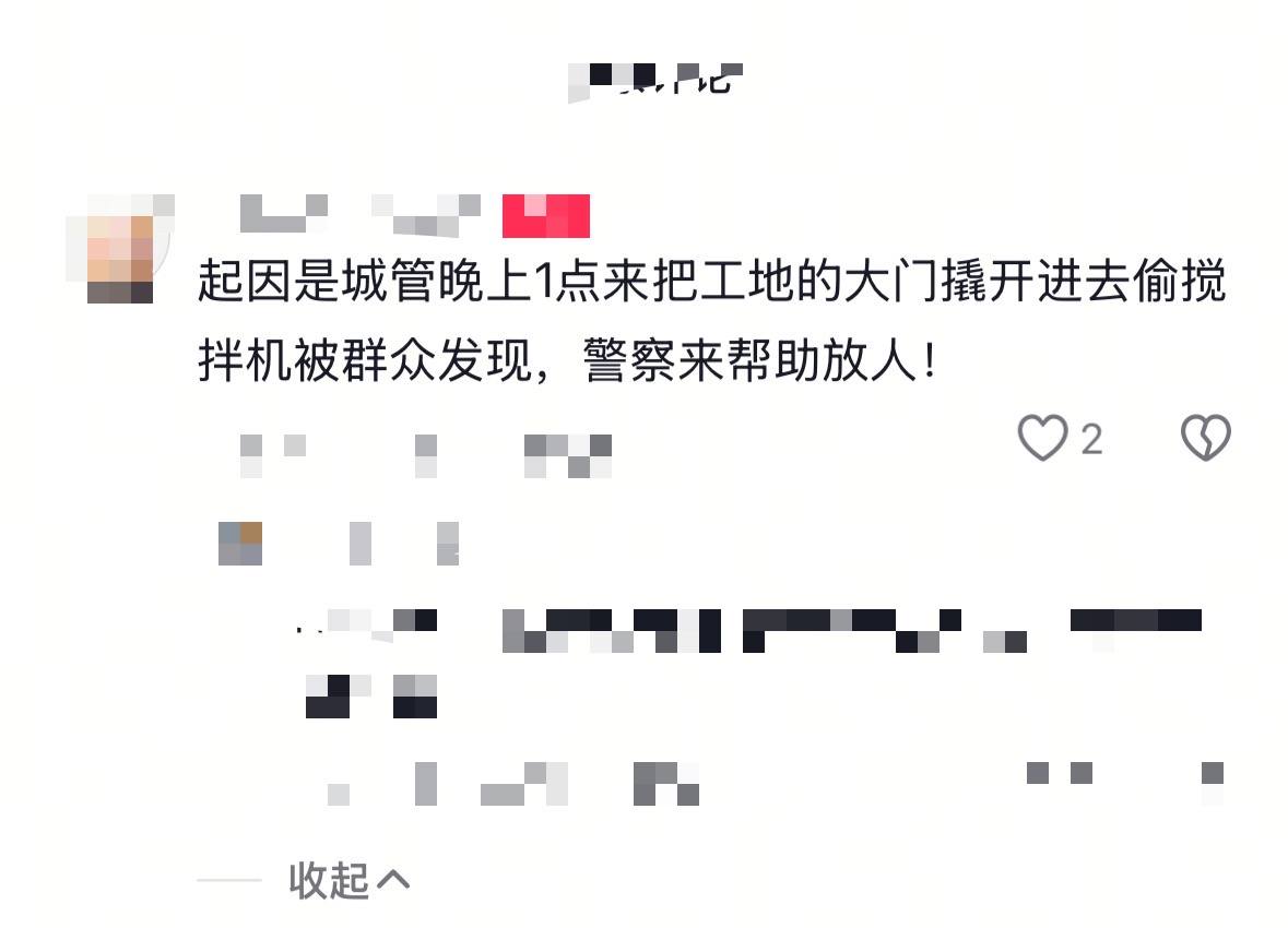 网友在指摘区留言,接头具体发生了什么。对此,视频发布者留言酬报:“启事是城管晚上1点来把工地的大门撬开进去运走搅动机被公共发现。”并称,该事件不是城管部门规定,是沿途盗窃事件。