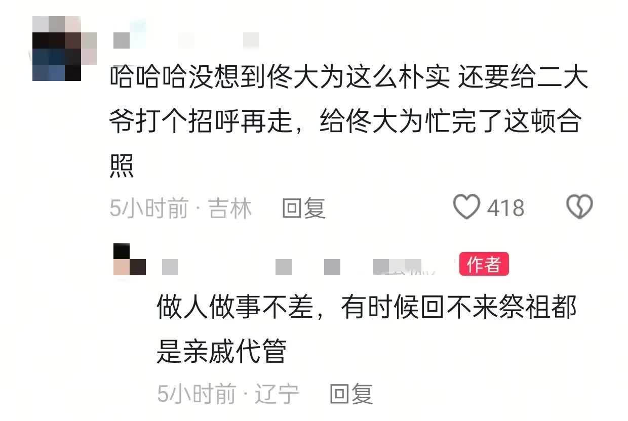 视频里,了了传来他权衡 “二大爷去哪儿了” 的声息,与二大爷谈别后,便准备离开。此番场景,让网友纷纷咨嗟佟大为的朴实无华。他不仅有益与二大爷打呼唤,还眷注地与周围乡亲合影迷恋。据拍摄视频的东谈主解析,佟大为普通里为东谈主处世绝顶厚谈,即便偶而因职责无法亲自总结祭祖,也会委派亲戚帮手代管,正因如斯,他与九故十亲相处得极为融洽。
