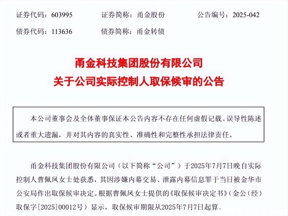 甬金股份的试验适度东说念主之一曹佩凤,因涉嫌参与内幕交游并走漏未公开信息,已被摄取取保候审按序。