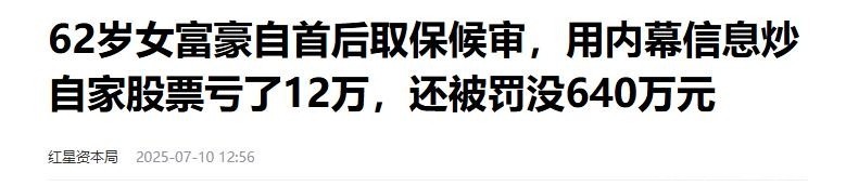 参考开头:红星成本局2025.07.10《62岁女富豪自首后取保候审,用内幕信息炒自家股票亏了12万,还被罚没640万元》
