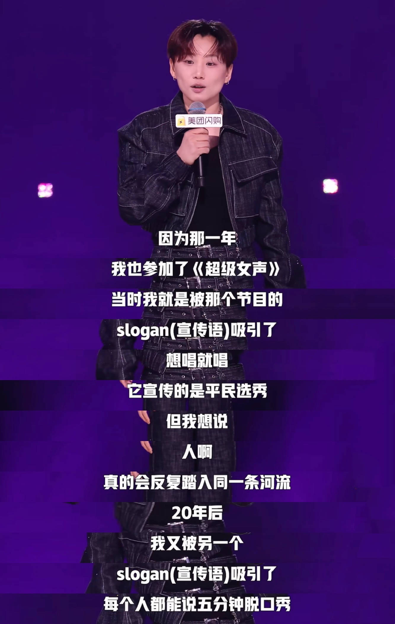 20年后,邱月再一次站上激勉现象级热度的“草根舞台”,讴颂照旧让位于解嘲现实的脱口秀,“东说念主东说念主都能讲五分钟”的slogan与也曾的“想唱就唱”山鸣谷应。通常精良心境体验和身份态度,两个期间相似的“苍生性”诉求呈现出的却是迥异的气质。