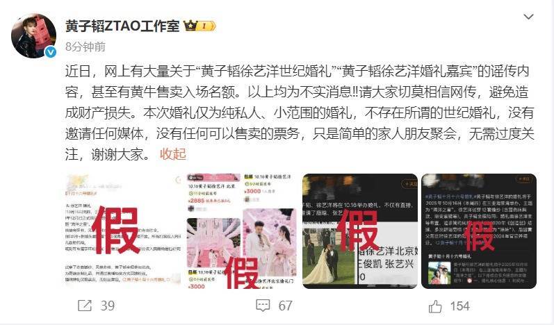 10月14日晚,黄子韬、徐艺洋责任室发文回复:近日,网上有大齐对于“黄子韬徐艺洋世纪婚典”“黄子韬徐艺洋婚典嘉宾”的讹传践诺,致使有黄牛售卖入场限额。以上均为伪善音尘。请天下切莫坚信网传,幸免变成财产亏损。本次婚典仅为纯私东说念主、小限度的婚典,不存在所谓的世纪婚典,莫得邀请任何媒体,莫得任何不错售卖的票务,仅仅肤浅的家东说念主一又友约聚,无需过度关爱,谢谢天下。