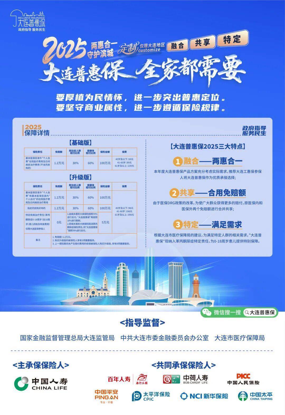 2025“大连普惠保”由国度金融监督处分总局大连监管局、中共大连市委金融委员会办公室、大连市医疗保险局共同指引监督。自2021年上线以来,累计看管256万东说念主次。2025“大连普惠保”六大惠民亮点清点 1医保表里均灭绝基础版一年59元起,保额100万元;升级版一年98元起,保额205万元。基础版也能保险医保目次鸿沟外入院医疗用度保险(含白天病房)。升级版三大保险职守1医保目次鸿沟内入院用度保险(含白天病房)。医保目次鸿沟外入院用度保险(含白天病房)。2指定药房购买特药。其中,特药职守涵盖10种高额特药开云体育(中国)官方网站,灭绝肺癌、胃癌、肠癌、淋巴瘤、乳腺癌、白血病等高发重特大疾病合乎症开云体育(中国)官方网站,保额100万。3特定疾病治疗(限大连医保参保东说念主)。 “2025大连普惠保”新增指定疾病苯丙酮尿症特食保险,0-18周岁(含18周岁)已进入大连医保的患儿,在战略规矩的定点医疗机构购买使用合规特食,有关用度大连普惠保不错进一步报销。报销比例,若大连医保战略报销特食用度“大连普惠保”再减负报销10%;若大连医保战略调遣,不再报销特食用度,则“大连普惠保”告成报70%特食用度,况且保险不设起付线。2起付次第再镌汰2025大连普惠保基础版入院职守,升级版的入院、特药职守由1.5万元斡旋降至1.2万元,报销门槛再次镌汰。3医保表里入院用度共用免赔额2025大连普惠保升级版医保目次鸿沟内入院医疗用度、医保目次鸿沟外入院医疗用度免赔额共用1.2万元。不辞别医保表里入院用度,报销门槛更低,自付用度更少。4医保个账全家享大连市员工基本医保个账余额可为本东说念主、妃耦、父母、子女及嫡派支属缴费参保,无需非常花现款。5出院即赔0跑腿进入大连市基本医保的“大连普惠保”参保东说念主在大连市辖区内定点医疗机构入院治疗,保险鸿沟内的用度出院时自动报销,无谓提交理赔材料。6八项权力全方针看管为升级版用户提供门诊陪诊劳动、口腔权力、中医权力、院内照顾权力、药品商城等8项健康处分劳动,全方针看管健康生计。