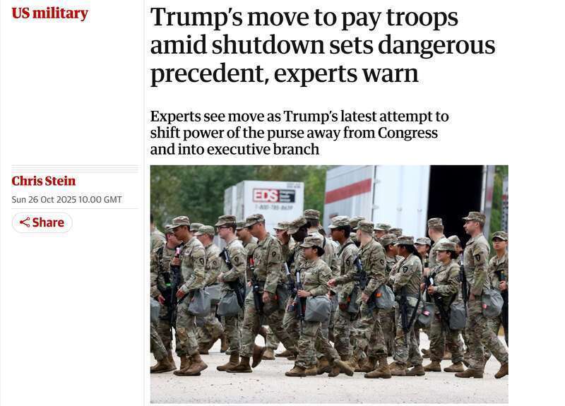 《卫报》指出,对在野的共和党来说,军东谈主是不可阵一火的选民群体。因此,白宫自月初以来一直试图通过独特时间确保军东谈主在政府“停摆”时间也能闲居拿到工资。不外,在部分法律学者看来,政府部门绕建国会的尝试威迫了后者贬抑巨匠支拨的职权,若不加以贬抑,可能给更多有争议的行政门径奠定基础,举例在好意思国各大城市部署队列。