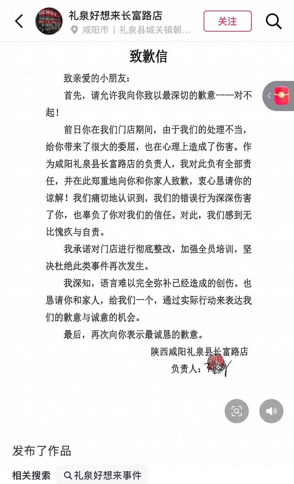 2月4日晚间,好思来涉事门店布致歉信。认真东说念主默示,堤防地向孩子偏激家东说念主致歉,由衷恳请孩子偏激家东说念主的存眷!同期原意,对门店进行透顶整改,加强全员培训,根绝此类事件再次发生。
