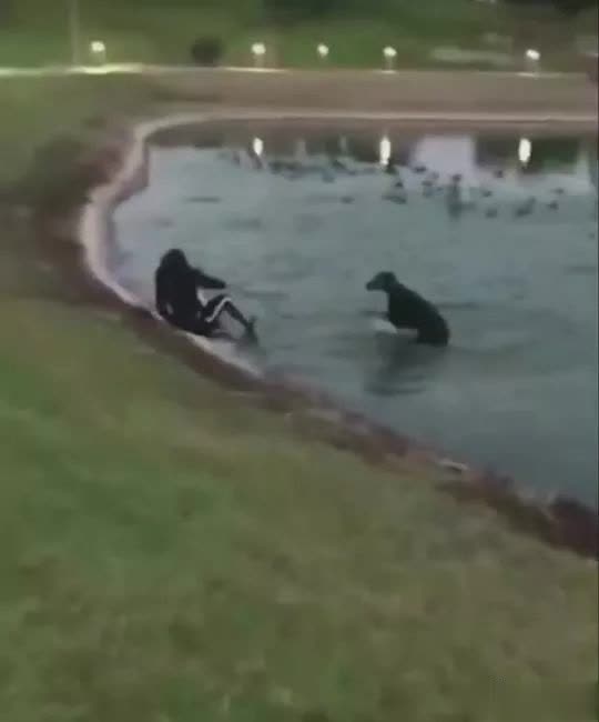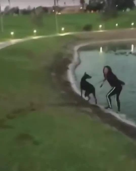 宠主还试图往回拉狗,没念念到却被狗拖着一步一步的离着水边越来越近...