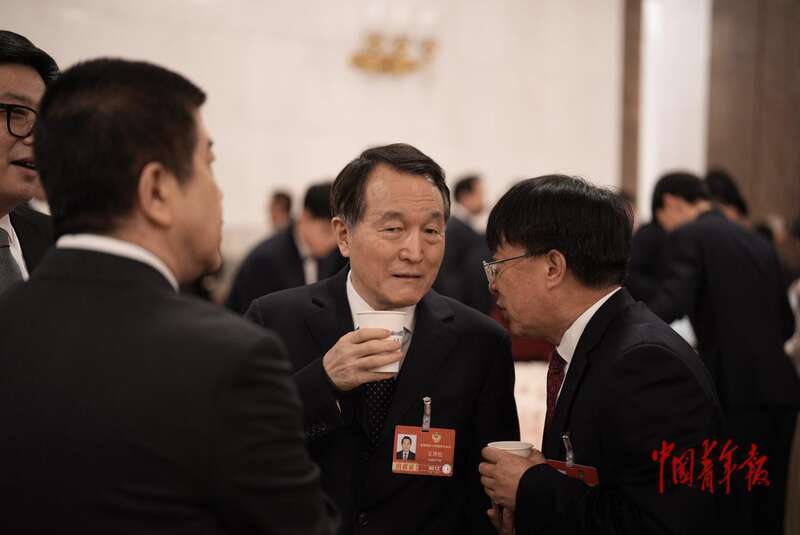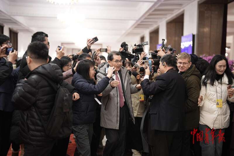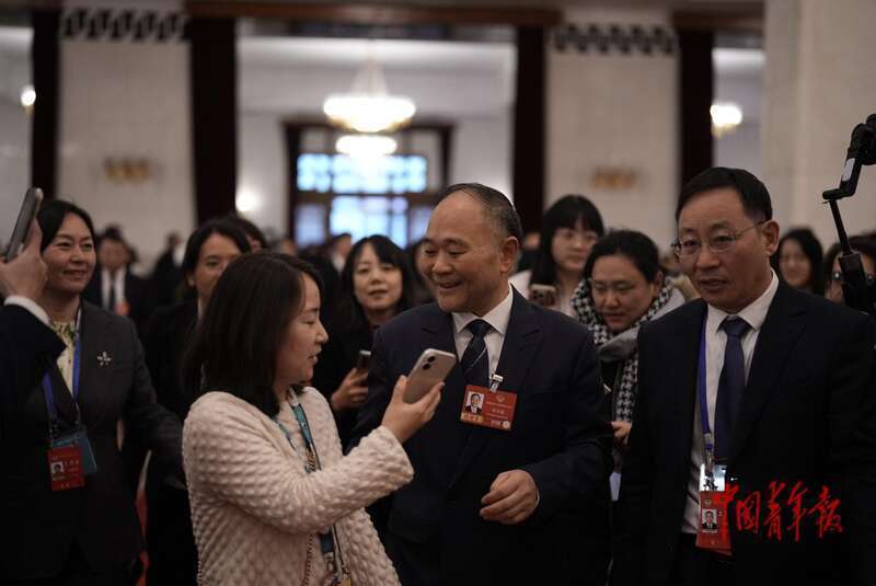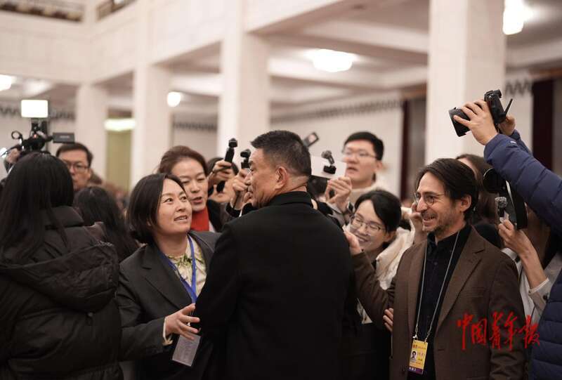 3月4日,北京,东谈主民大礼堂,世界政协十四届四次会议开幕会前,世界政协委员、中国驻日本大使吴江浩被记者们“围堵”。中青报·中青网记者 李隽辉/摄