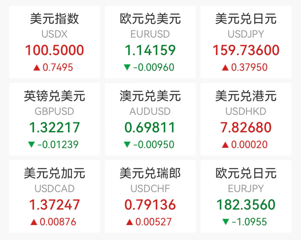 好意思元指数收盘价创年内新高,初次升破100,涨幅达0.75%。好意思元兑日元升至2024年7月以来最强水平。