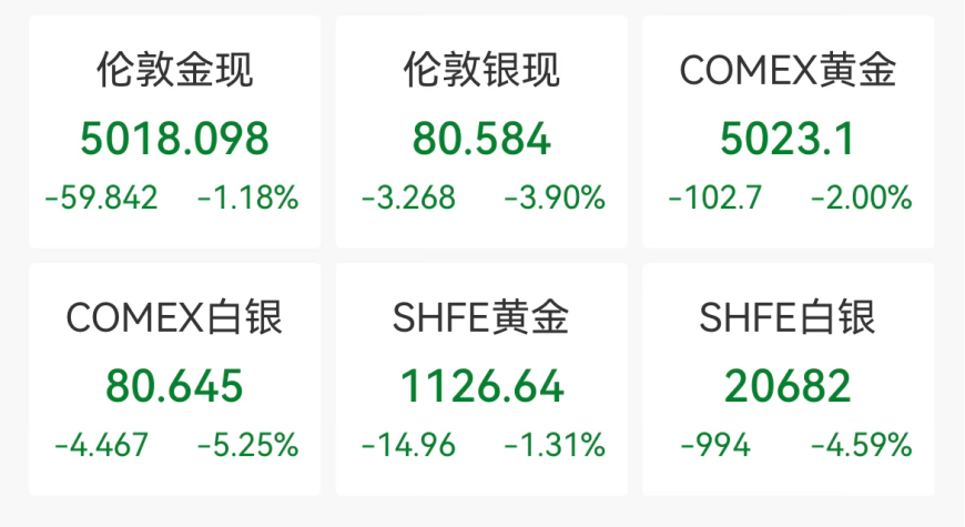 贵金属价钱普跌。终止收盘,现货黄金向下涉及5018好意思元/盎司,日内跌1.18%;现货白银跌3.9%,报80.584好意思元/盎司;现货钯金日内跌近4%,现报1551好意思元/盎司。