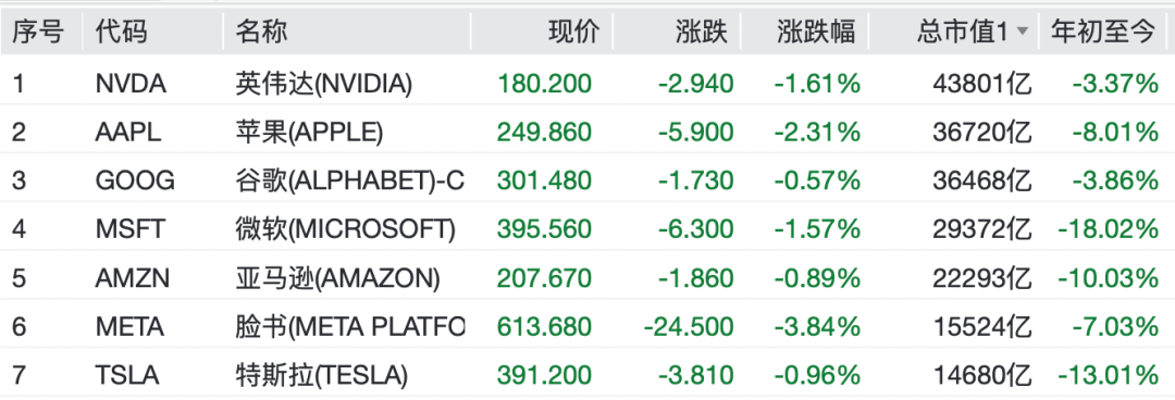 好意思国科技七巨头指数跌1.59%。META跌3.84%,苹果跌2.31%,英伟达、微软跌超1.5%,特斯拉跌近1%。