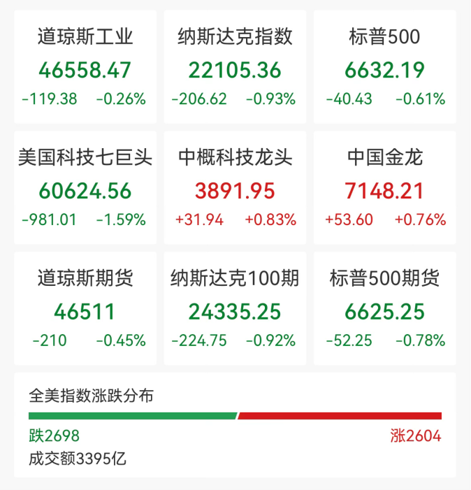 终止3月13日周五收盘,谈琼斯工业平均指数跌0.26%,报46558.47点;标普500指数跌0.61%,报6632.19点;纳斯达克详尽指数跌0.93%,报22105.36点。谈指、标普500指数录得三连跌。